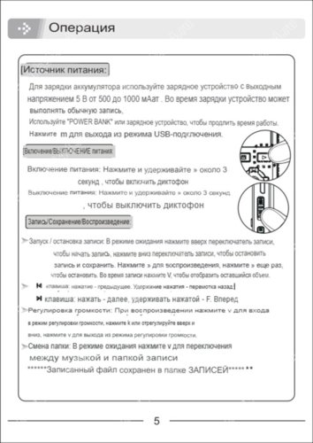 Переключение между аудиодорожками. Кратковременно нажимать клавиши вперед – назад. Перемотка аудио записи (файла) вперед – назад. При прослушивании аудио файла нажать и удерживать клавишу со значком вперед/назад. Регулировка звука, увеличить – уменьшить уровень. При прослушивании файла нажать кратко клавишу V, клавиши вперед – назад использовать чтобы увеличить – уменьшить уровень. Переключения между папками с аудиозаписями. Аудио запись выключена. Пауза в прослушивании. Кратко нажать на клавишу V.